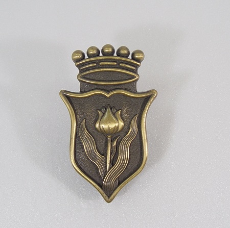 A curtain finial in a shield shape, and there is a tulip texture on it. On top of the shield there's a dimensional crown. It will go well with royal, elegant curtains.